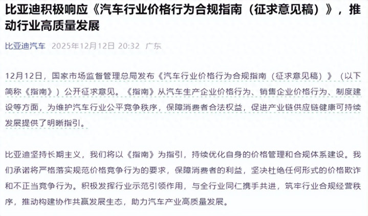 《征求意见稿》发布后,目前长城、长安、小鹏、北汽、比亚迪等车企均已表态支持,承诺优化价格管理体系,维护公平竞争环境,促进行业健康发展。